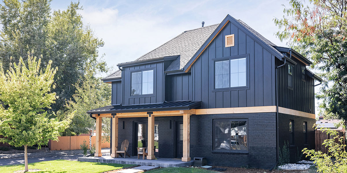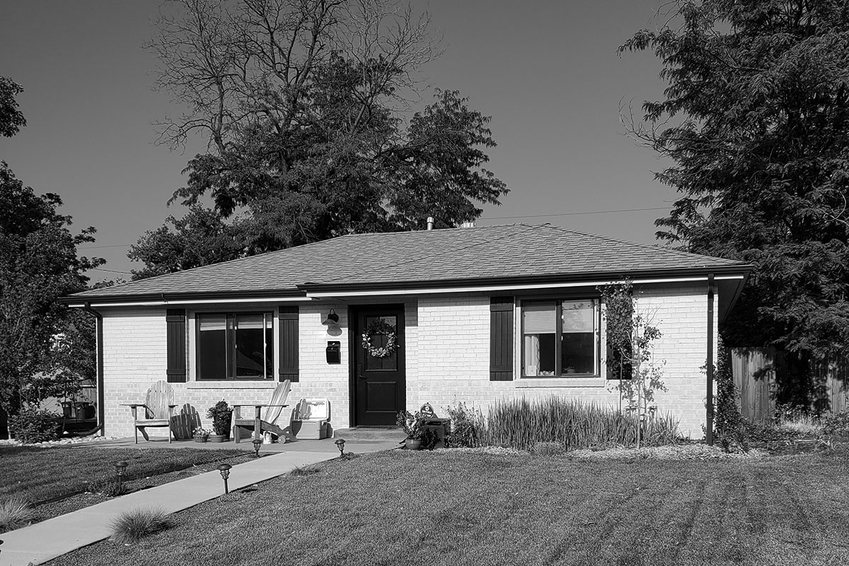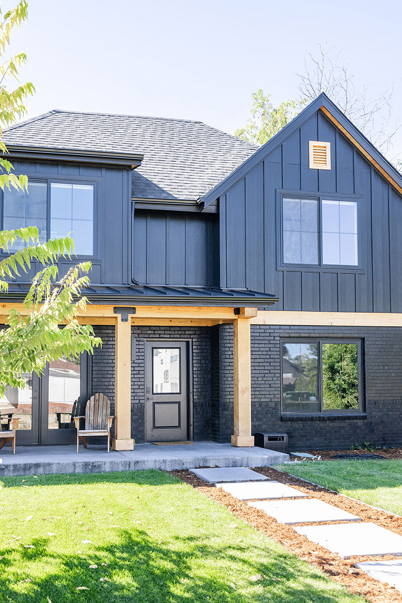 The home’s exterior improvements effortlessly blend old with new in the clients’ neighborhood of traditional brick and wood-framed homes. The home’s original brick siding was preserved, with a new board and batten on the pop up addition. Desiring a departure from neighboring homes with white exteriors, the clients chose an inky black paint color. Natural wood beams and columns add a warm contrast and visually break up the exterior elevation.